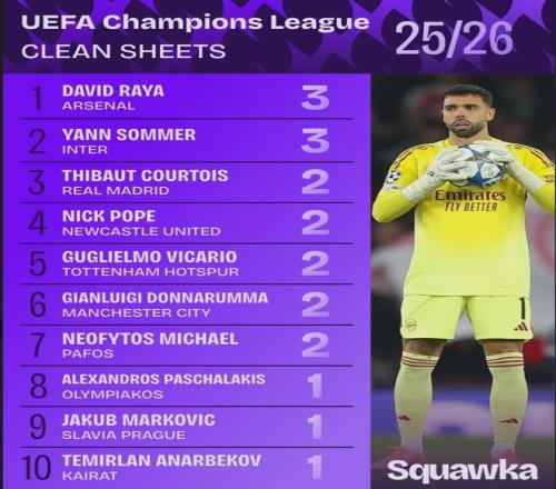 Squawka统计,拉亚和索默尔在本赛季欧冠比赛中3场比赛全部完成零封,阿森纳和国米门将也是仅有的本赛季欧冠尚未失球的门将。