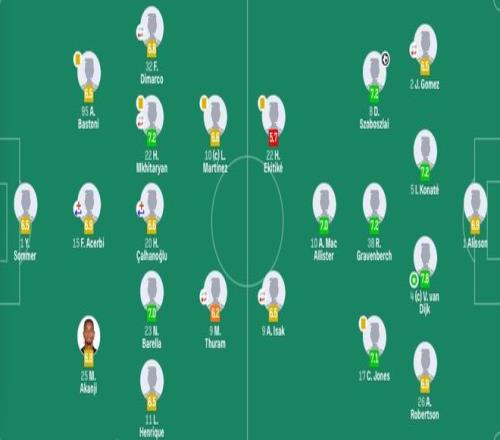 国米首发:1-索默、95-巴斯托尼、15-阿切尔比(31'31-比塞克)、25-阿坎吉、32-迪马尔科(83'30-奥古斯托)、23-巴雷拉、11-恩里克、20-恰尔汗奥卢(11'7-泽林斯基)、22-姆希塔良(82'8-苏契奇)、9-图拉姆(83'14-博尼)、10-劳塔罗