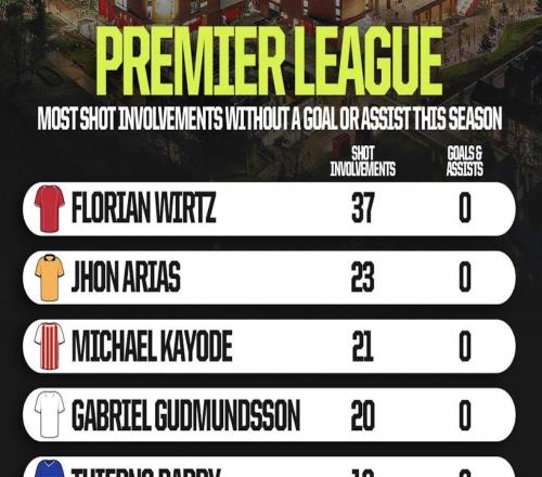 据Opta统计,利物浦中场维尔茨本赛季英超直接参与了37次射门,但仍0球0助,为所有还没直接参与进球的球员中最多。维尔茨本赛季英超已经完成了37次射门但未取得进球,上一轮对阵桑德