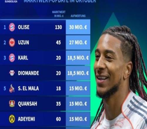 德甲身价更新:奥利塞暴涨3000万至1.3亿欧,穆西亚拉1.4亿欧仍居首